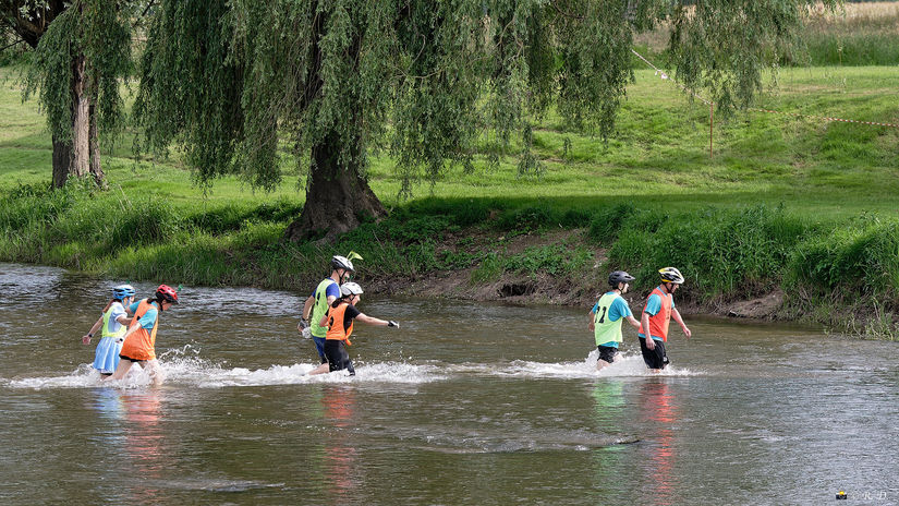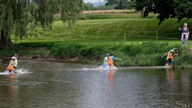 Les participants traversent l'Arroux pour rejoindre le départ du canoë, situé de l'autre côté de la berge.